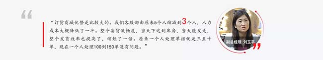 訂貨商城優(yōu)勢(shì)是比較大的。我們客服部由原來(lái)5個(gè)人縮減到3個(gè)人,人力成本大概降低了一半。整個(gè)備貨流暢度,當(dāng)天下達(dá)到庫(kù)房,當(dāng)天能發(fā)走,整個(gè)發(fā)貨效率也提高了,縮短了一倍。原來(lái)一個(gè)人處理單據(jù)就是三五十單,現(xiàn)在一個(gè)人處理100到150單沒(méi)有問(wèn)題。