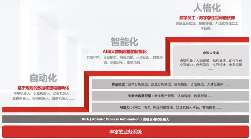 不同于閱讀、聊天、搜索等面向終端用戶的應(yīng)用場景,人工智能在企業(yè)級(jí)領(lǐng)域的應(yīng)用更具復(fù)雜性。在這一過程中,從早期依托RPA技術(shù)實(shí)現(xiàn)基于規(guī)則的數(shù)據(jù)和流程自動(dòng)化,到借助OCR、NLP、算法模型等實(shí)現(xiàn)AI和大數(shù)據(jù)賦能的智能化,再到基于虛擬人技術(shù)的數(shù)智員工的誕生,AI技術(shù)在企業(yè)領(lǐng)域的應(yīng)用歷經(jīng)自動(dòng)化、智能化、人格化的發(fā)展過程。
