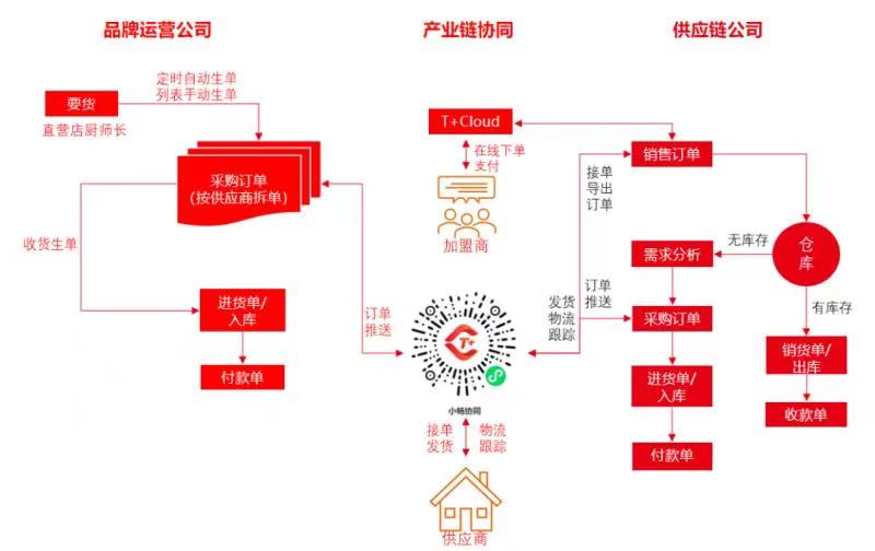 為了滿(mǎn)足餐飲門(mén)店要貨頻率高、時(shí)效性要求高的需求,遇江南在用友暢捷通T+Cloud的幫助下,應(yīng)用【智能供應(yīng)鏈】打通了“門(mén)店-供應(yīng)鏈公司-供應(yīng)商”三者之間的信息鏈路。