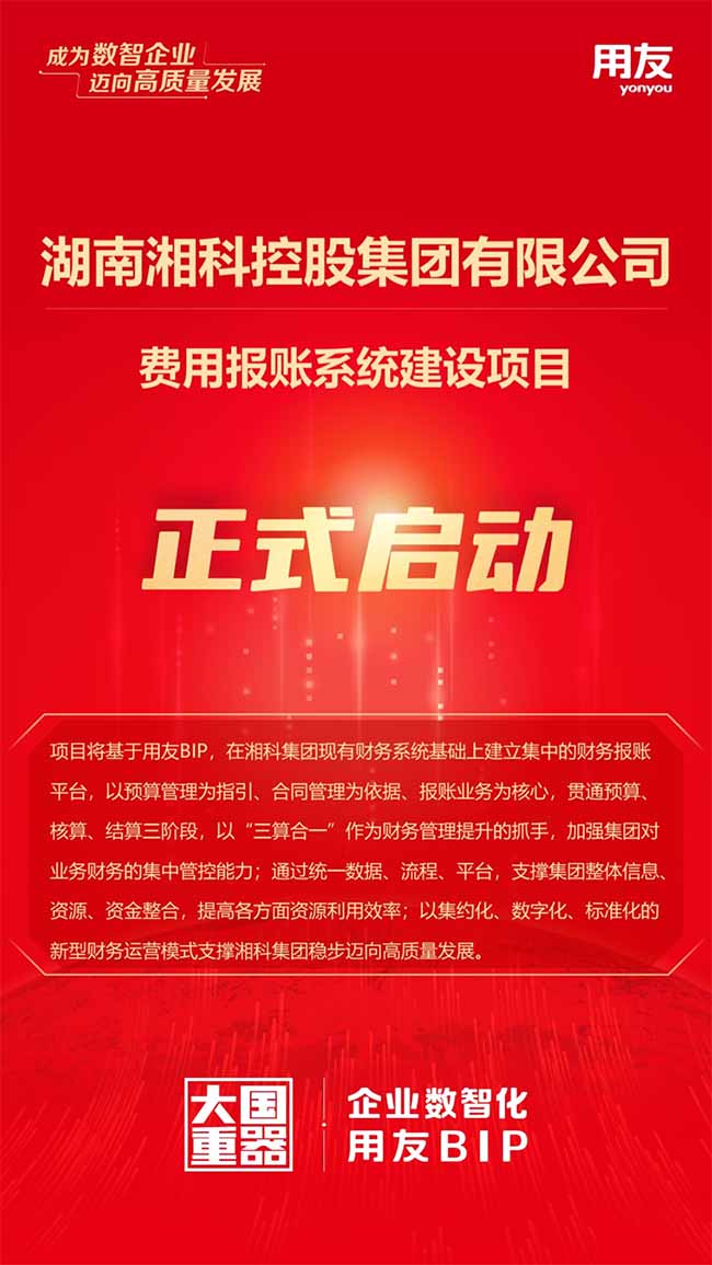 “十四五”時(shí)期是湘科集團(tuán)全面推動(dòng)高質(zhì)量發(fā)展的關(guān)鍵期。湘科集團(tuán)積極貫徹落實(shí)國(guó)務(wù)院、國(guó)資委提出的“加快推進(jìn)國(guó)有企業(yè)數(shù)字化轉(zhuǎn)型”要求,攜手用友開(kāi)啟財(cái)務(wù)數(shù)智化建設(shè)新征程,以財(cái)務(wù)數(shù)智化牽引集團(tuán)整體數(shù)智化,支撐企業(yè)在新時(shí)期做優(yōu)做大做強(qiáng)。