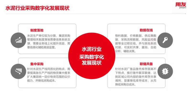 用友以企業(yè)采購數(shù)智化變革研究為基礎(chǔ),針對水泥行業(yè)進(jìn)行專項(xiàng)分析,發(fā)布用友BIP水泥行業(yè)采購及供應(yīng)鏈解決方案。