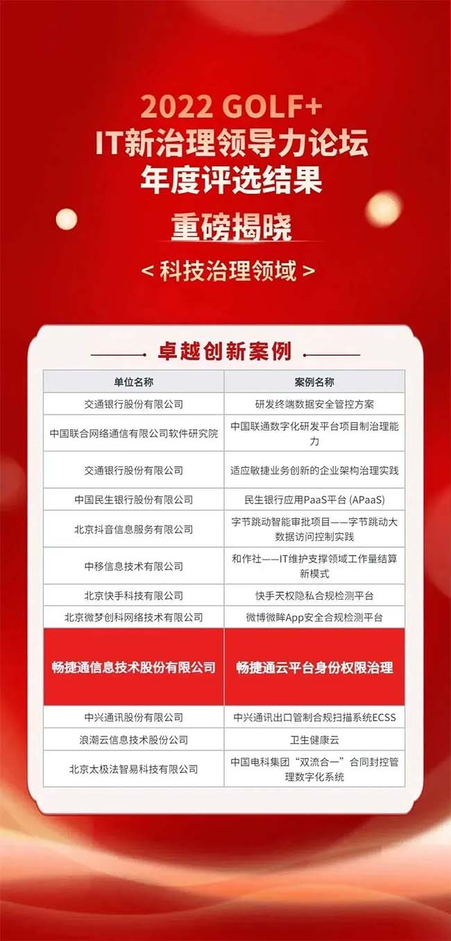 近日,由中國信息通信研究院主辦的“GOLF+IT新治理領導力論壇”年度評選活動結果發(fā)布。用友暢捷通實施部署的【暢捷通云平臺身份權限治理】項目,憑借卓越的產品力和優(yōu)秀的安全體驗,在一眾產品中脫穎而出,成功入選科技治理領域“卓越創(chuàng)新案例”榜單。